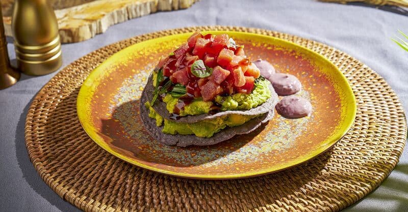 Ahi tuna tartare, soy wilted kale, mashed avocado, soy glaze, roasted pepper & sesame aioli, blueberry & mustard wasabi, crispy blue corn tortilla.